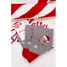 Hřejivé dámské vánoční ponožky v tmavě šedém odstínu se vzorem sněhových vloček a motivem medvídka v čepici Mikuláše. Vyrobené z měkké směsi s podílem vlny, která poskytuje tepelný komfort, měkkost a pohodlí při nošení. Perfektní volba pro zimní období a vánoční atmosféru doma i venku.