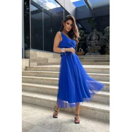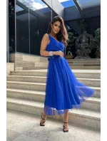 Tylové midi šaty s mírně rozšířenou vrstvenou sukní. Vrchní část výtvoru na silnějších popruzích, dokonale přiléhající k pasu. Ramena a záda jsou odhalená. Model dodávající eleganci a ženskost. Šaty jsou podšité a zapínají se na krytý zip. K dispozici v různých barvách.
