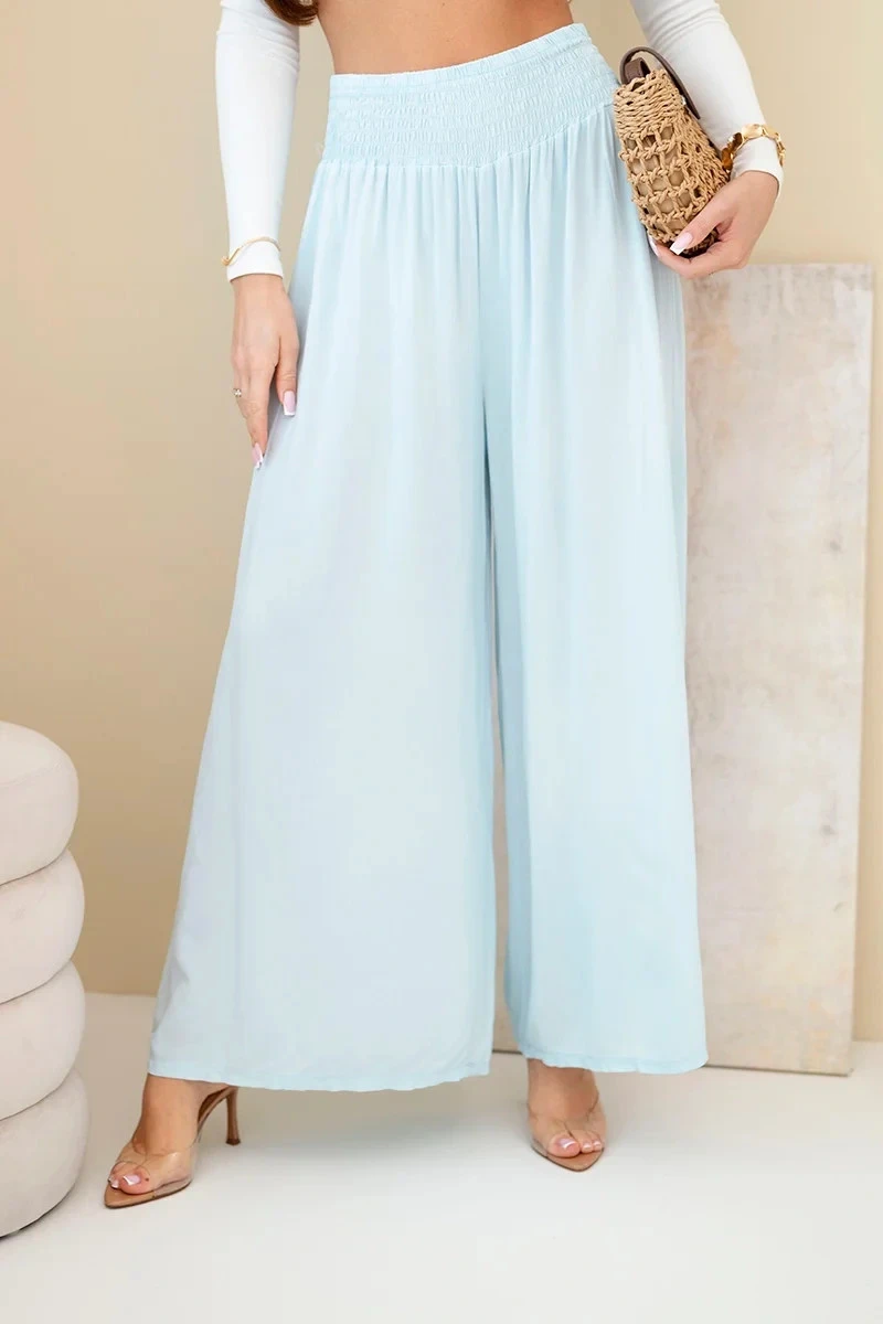 Pokud hledáte pohodlné a stylové kalhoty na každý den nebo na dovolenou, tyto dámské palazzo kalhoty jsou trefou do černého! Vyrobené ze 100% lehké, vzdušné viskózy poskytují nejen komfort při nošení, ale také krásně padnou na postavu. Široké nohavice a rozšířený střih dodávají každému pohybu lehkost a eleganci a elastický pas se skvěle přizpůsobí pasu. Ideální na procházku, nákupy i na pláž – stačí přidat jednoduchý top a je to! Univerzální model, který by neměl chybět ve vašem šatníku. Velikost je univerzální a hodí se pro ženy velikosti S, M nebo L.