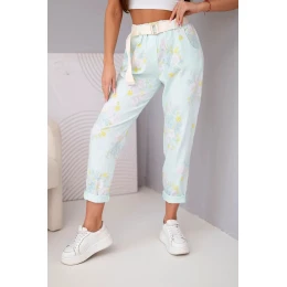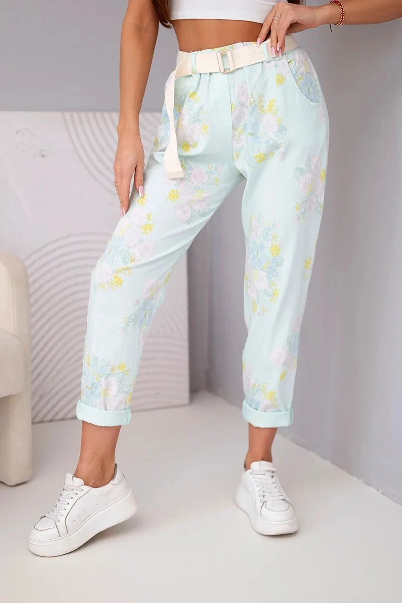 Dámské viskózové květované kalhoty s páskem mátové
