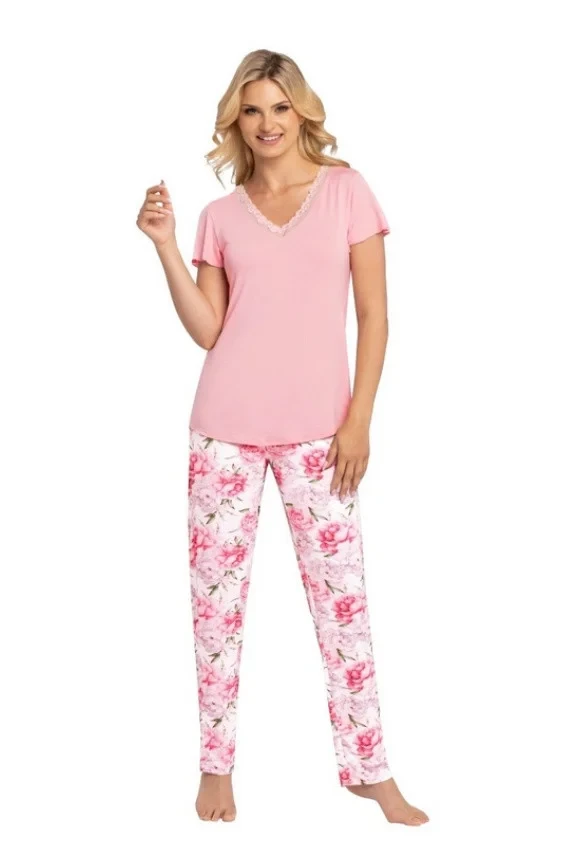 Dámské viskózové pyžamo Tiffany s krátkým rukávem a dlouhými kalhotami od značky BABELLA. Jednobarevné tričko je ozdobené jemnou krajkou ve výstřihu. Kalhoty s květinovým vzorem jsou šité bez kapes a mají volnou gumu v pase. Pyžamo je ušité z kvalitní měkké viskózy, která poskytuje maximální komfort při nošení. Je lehké a jemné.