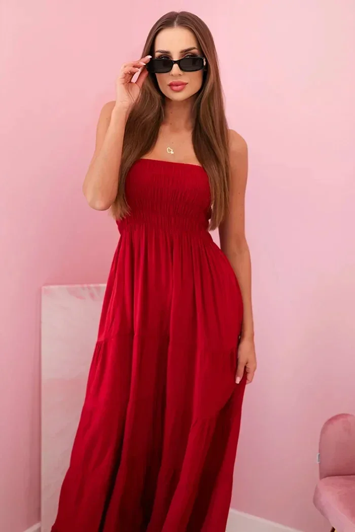 Tato dámská maxi šaty jsou ideální volbou na teplejší dny – okouzlují lehkostí, ženským střihem a pohodlím při nošení. Díky elastickému, nařasenému hornímu dílu se krásně přizpůsobí postavě, zvýrazní pas a poprsí, a rozšířený spodní díl dodává celku lehkost a volnost. Ušité ze 100% prodyšné viskózy zajišťují pohodlí po celý den – ať už si je vyberete na procházku, dovolenou nebo setkání s přáteli. Model je velmi ženský a univerzální – skvěle vypadá samostatně i v kombinaci s džínovou bundou nebo sandály. Jemné řasení dodává šatům kouzlo a zajišťuje efektní vzhled. Velikost je univerzální a bude vhodná pro ženy velikosti S, M nebo L.