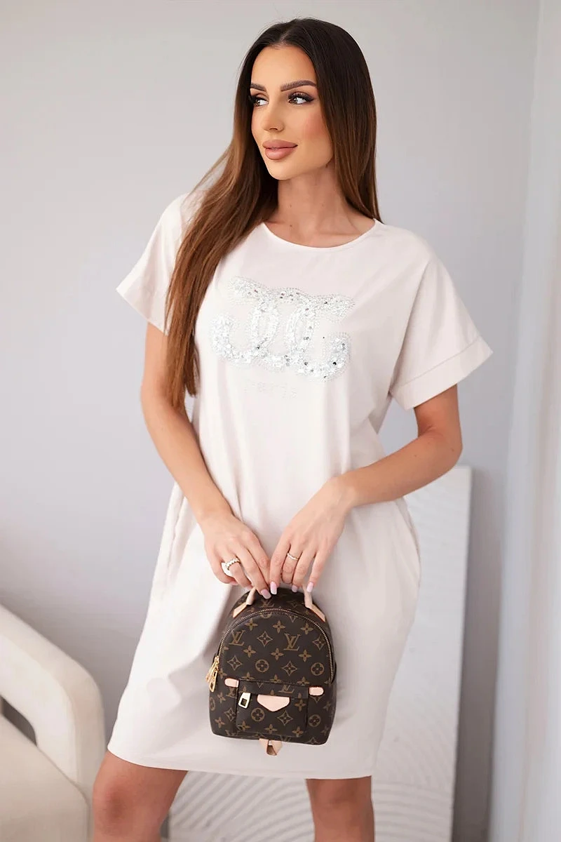 Dámské viskózové šaty s krátkým rukávem a ozdobným potiskem béžové