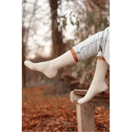 Teplé dámské ponožky v ecru odstínu z měkké vlněné směsi. Hřejivý materiál poskytuje pohodlí a teplo, ideální pro zimní období a domácí i venkovní nošení.