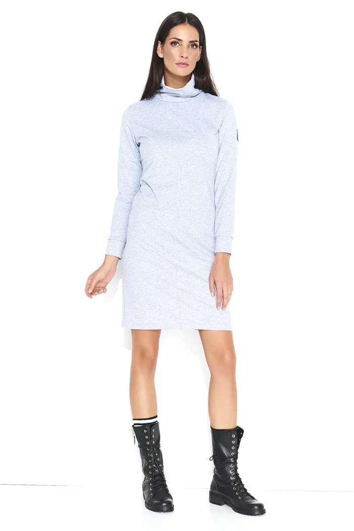 Dámské volnočasové šaty s rolákem středně dlouhé šedé. Tento model šatů má dlouhý rukáv a příjemný roláček a kožené logo značky na rukávu. V zadní části je všitý zip pro pohodlné oblékání. Šaty jsou vyrobeny z velice příjemného materiálu, můžete je využít pro volný čas nebo běžné nošení. Tyto šaty se vyrábějí v EU. Materiál, ze kterého jsou šaty vyrobeny je elastický a příjemný na omak.
