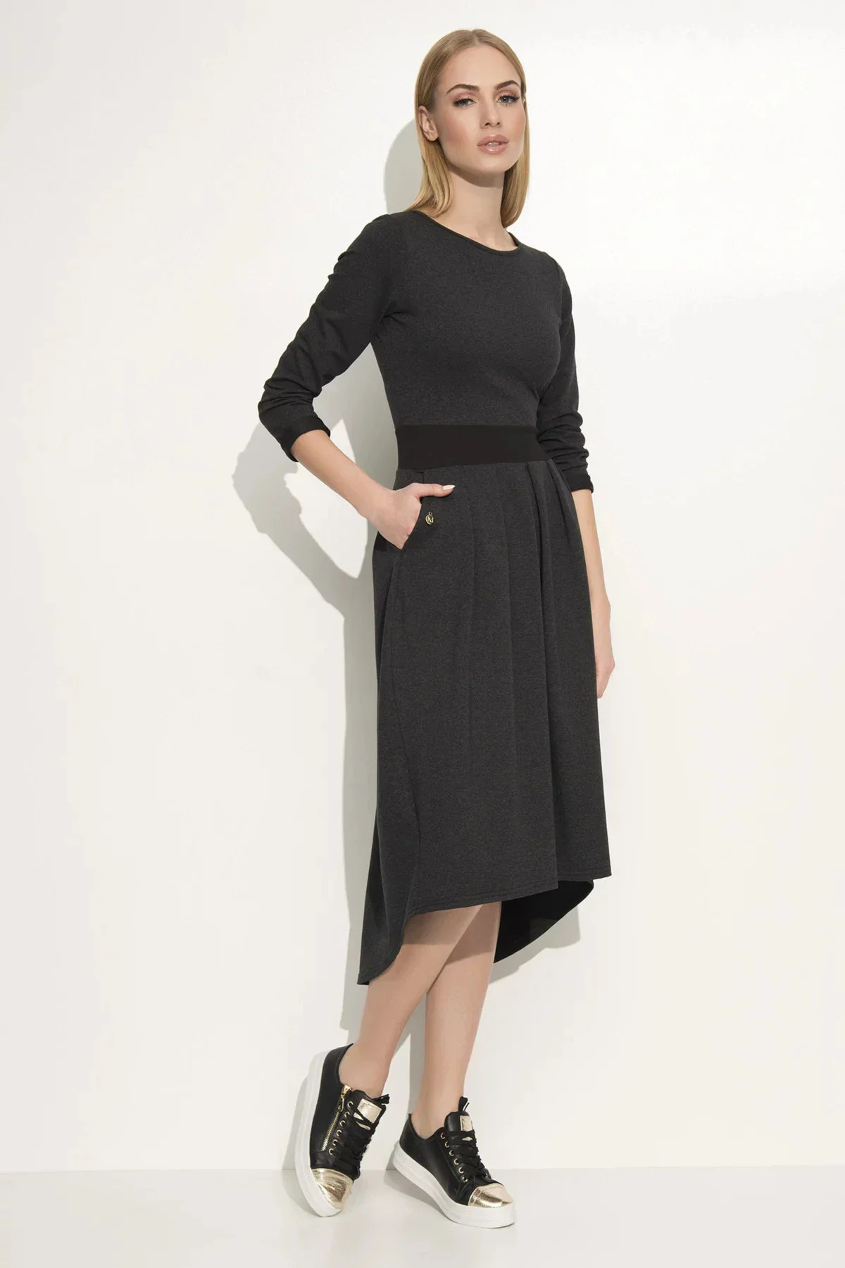 Dámské volnočasové šaty s asymetrickou sukní. Tento model šatů má 3/4 rukáv a kulatý výstřih. Pás je zvýrazněn černým pruhem elastické látky. Spodní část šatů je řasená asymetrická sukně, kdy přední část sahá po kolena. Sukně má všité kapsy. Šaty můžete využít pro volný čas nebo běžné nošení.