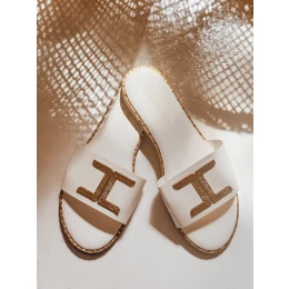 Žabky z ekokůže na ploché podrážce jsou módním a funkčním doplňkem každého letního šatníku. Zlatý akcent v podobě velkého loga dodává eleganci, zatímco ozdobné lemování na podrážce upoutá pozornost. Lehký střih je ideální na prázdninové výlety.