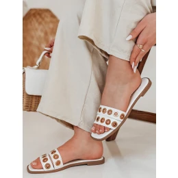 Módní dámské žabky s nadčasovým designem, vyrobené výhradně z ekokůže. Pásky zdobené kovovými detaily jim dodávají jedinečný charakter. Měkká stélka a pohodlná plochá podrážka zajišťují pohodlí po celý den. V teplých letních dnech se skvěle hodí ke vzdušným šatům i džínům.