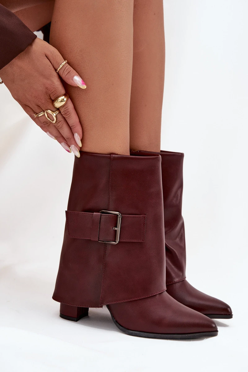 Dámské zateplené kotníkové botky na sloupku s ohrnovací manžetou a přezkou – bordó Ylenara