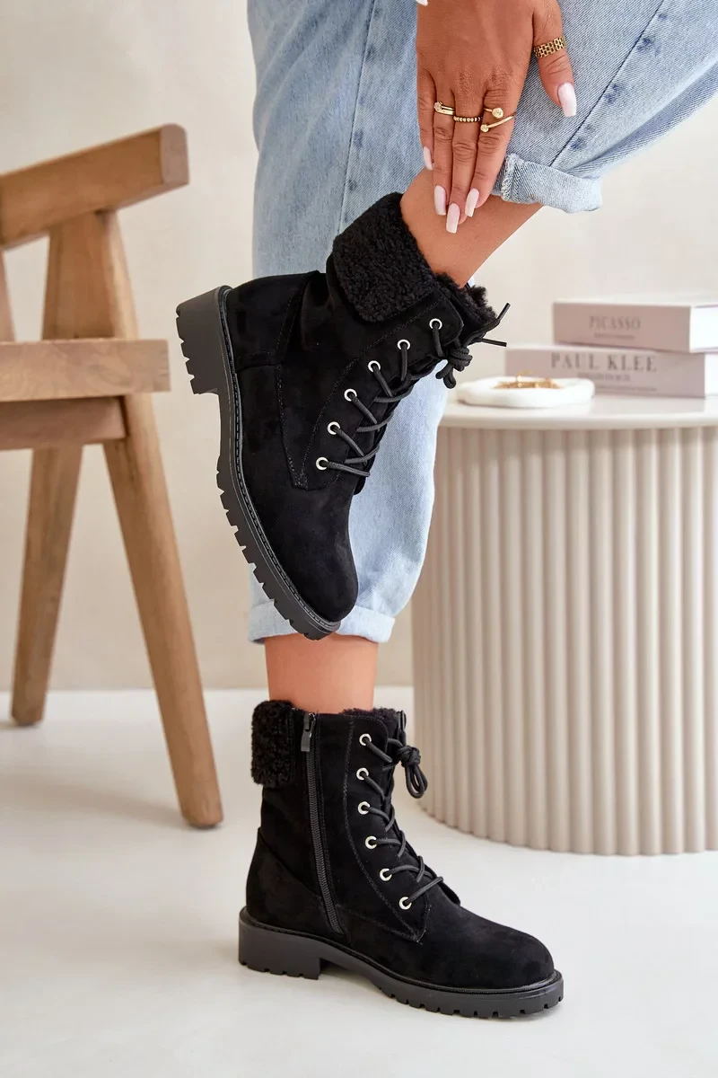 Dámské kotníkové boty vyrobené z měkkého eko semiše. Vnitřek zateplený obuvnickou dekou, což zajišťuje pohodlí v chladnějších dnech. Hora ozdobená stylovým kožíškem. Model šněrovací, s dodatečným zapínáním na zip, což usnadňuje obouvání a přizpůsobení noze. Ideální na podzimní a zimní procházky i každodenní stylizace. Při výběru velikosti se prosím řiďte tabulkou velikostí.