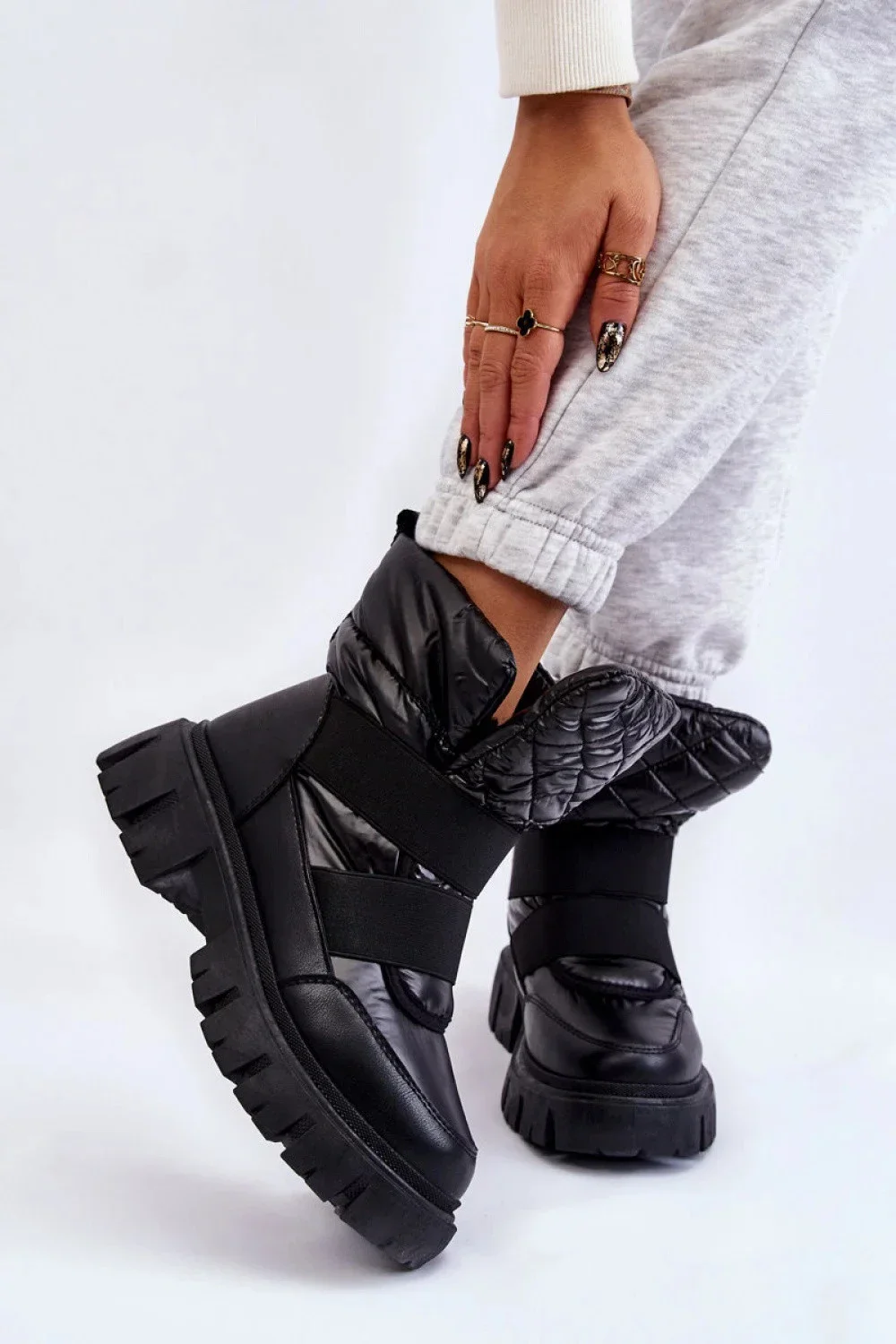 Černé zateplené boty jsou elegantní a praktickou obuví pro chladnější dny. Tyto boty mají švy v podobě gumiček, které usnadňují obouvání a zouvání obuvi a také je dále stabilizují na noze. Izolace uvnitř bot udrží vaše nohy při chůzi v teple a pohodlí. Černé boty se skvěle hodí k mnoha out-fitům a budou se hodit jak na každodenní nošení, tak na zvláštní příležitosti.