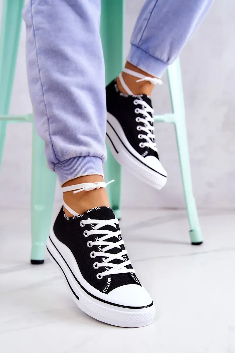 Tenisky vyrobené z textilního materiálu. Model se zavazuje plochými tkaničkami. Uvnitř měkká textilní podšívka. Svršek ke kotníku s textem. Boty mají kulatou, gumou vyztuženou tužinku. Jsou nasazeny na ploché podrážce s jemnými drážkami, která je navíc protiskluzová. Model se skvěle hodí k džínům, teplákům i vzdušným šatům. Při výběru velikosti použijte tabulku velikostí.