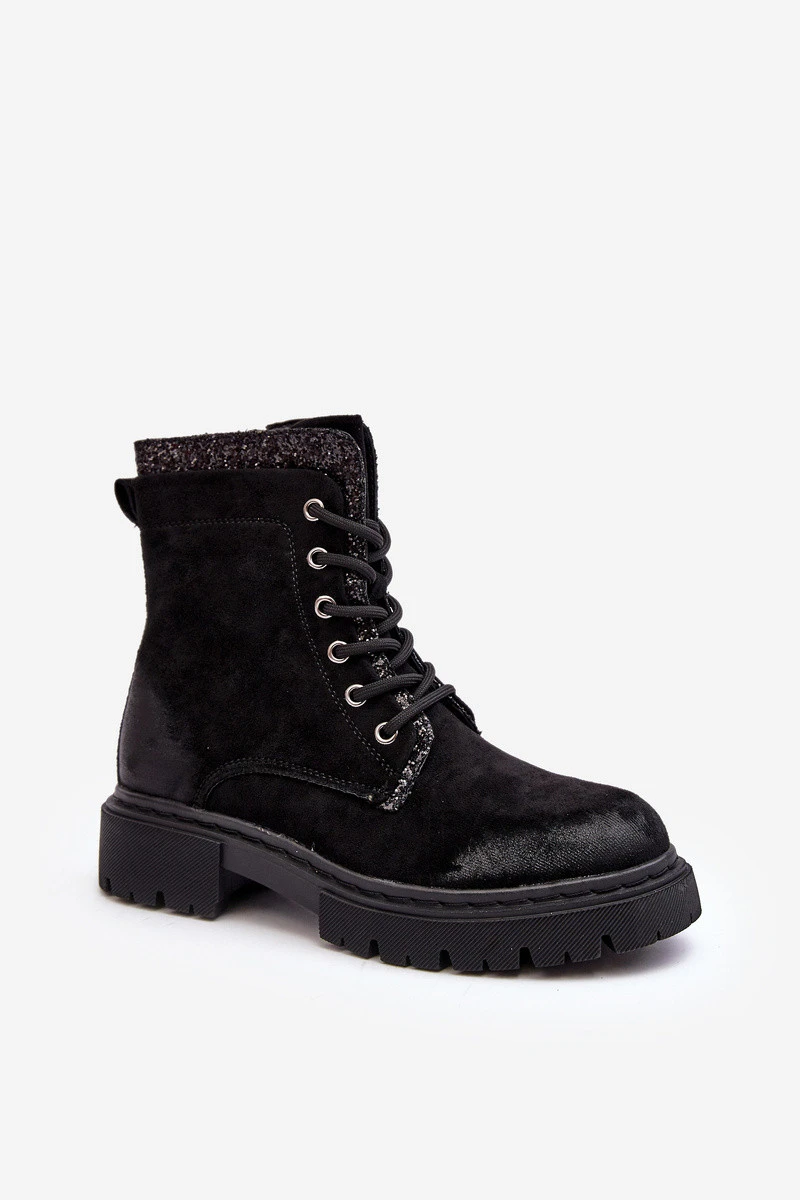 Boty dámské zdobené malými, lesklými šťastími. Umístěné na platformě a plochém podpatku. Zapínání na zip. Šněrování na přední straně. Špičky zaoblené. Střed oteplený kožešinou. Klasický model, který dokončí téměř každou podzimní-zimní stylizaci! Při výběru velikosti se řiďte tabulkou velikostí.
