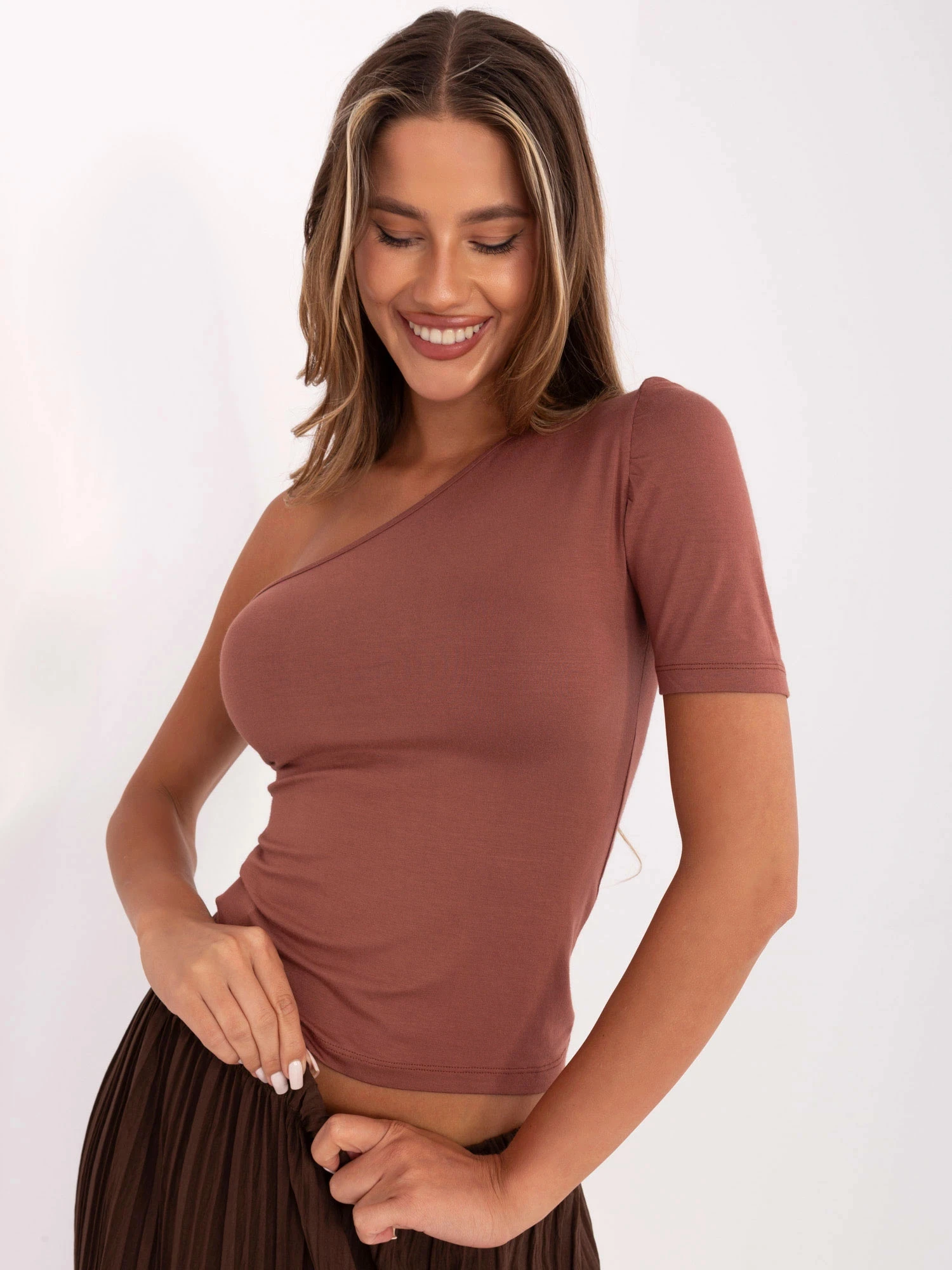 Halenka je vyrobená z pružného materiálu, má vypasovaný střih a asymetrický výstřih. Model má délku k bokům.