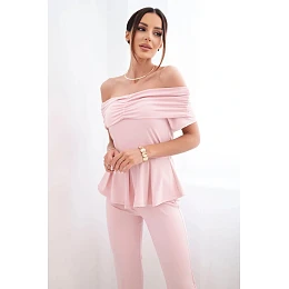 Elegantní dámský komplet je ideální volbou pro ženy, které chtějí vypadat stylově a žensky. Sada se skládá z efektní halenky typu Carmen a dlouhých kalhot se širokými nohavicemi, čímž vytváří módní a sladěný outfit. Halenka má krásný spadlý výstřih s volánem, který jemně odhaluje ramena a dodává romantický nádech. Přiléhavý střih s mírně rozšířeným spodkem zvýrazňuje pas a dodává lehkost.