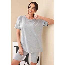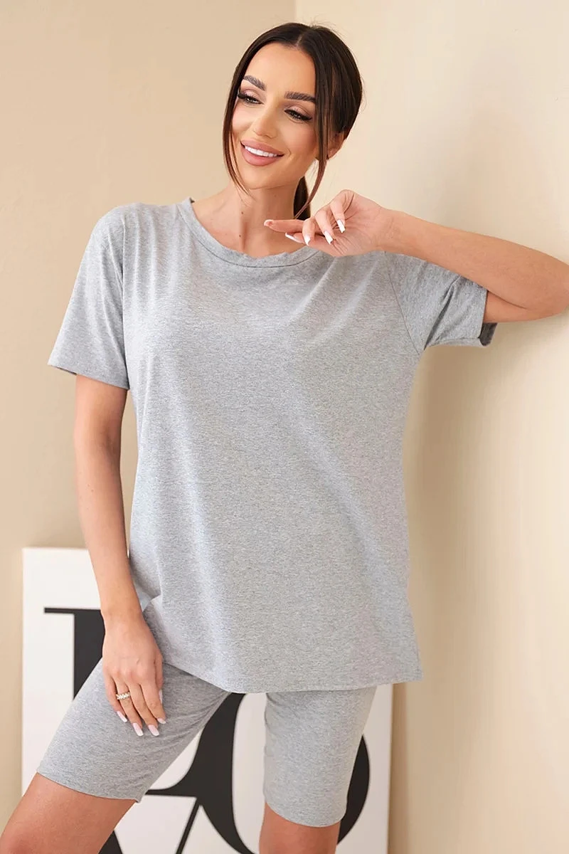 Pohodlný a stylový dámský komplet je ideální volbou pro ženy, které si cení komfortu a módního vzhledu pro každodenní nošení. Sada se skládá z klasického trička s krátkým rukávem a přiléhavých kraťasů, které společně tvoří soudržný a praktický outfit. Minimalistický střih činí komplet velmi univerzálním a snadno kombinovatelným – skvěle poslouží doma, na procházce i během letních dovolených.
