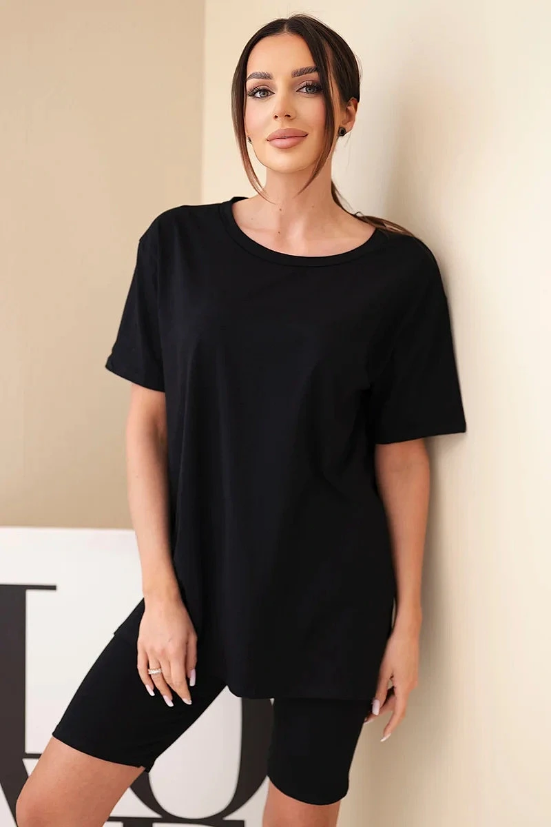 Pohodlný a stylový dámský komplet je ideální volbou pro ženy, které si cení komfortu a módního vzhledu pro každodenní nošení. Sada se skládá z klasického trička s krátkým rukávem a přiléhavých kraťasů, které společně tvoří soudržný a praktický outfit. Minimalistický střih činí komplet velmi univerzálním a snadno kombinovatelným – skvěle poslouží doma, na procházce i během letních dovolených.