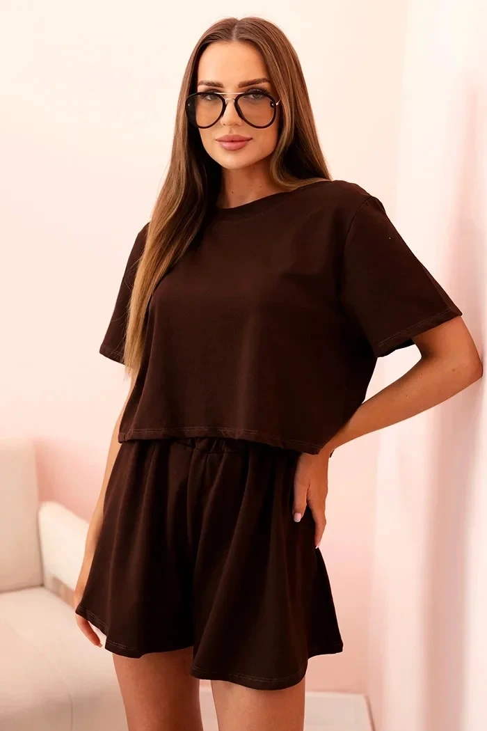 Dámský bavlněný komplet s širokými šortkami hnědý