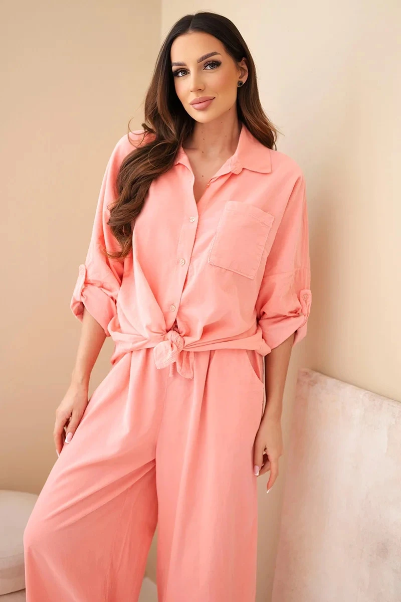 Dámský bavlněný komplet s vázanou košilí a širokou nohavicí meruňkový