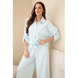 Dámský bavlněný komplet s vázanou košilí a širokými nohavicemi světle mátový