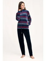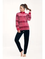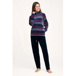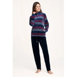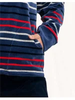 Pruhovaná mikina má jednobarevný stojáček, má pohodlné kapsy a zapíná se zipem. Jednobarevné kalhoty mají jednoduchý střih. Manžety jsou olemované stahovacími lemy.