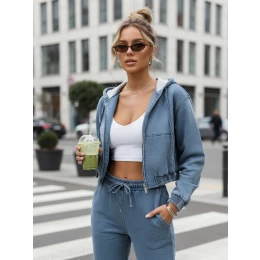 Tato dámská džínová bunda krátkého střihu kombinuje sportovní charakter s každodenním pohodlím. Měkká džínovina s příměsí elastanu poskytuje pohodlí a volnost pohybu. Zapínání na zip usnadňuje rychlé oblékání a kapuce zvyšuje funkčnost v chladnějších dnech. Elastický lem v pase zvýrazňuje pas a dodává siluetě proporce.