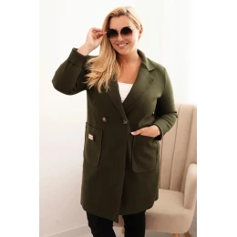 Tento klasický dámský kabát Plus Size je nadčasovým návrhem pro ženy, které si cení jednoduchosti, elegance a pohodlí. Model je vyroben z příjemného materiálu s jednolitou strukturou, má dvouřadé zapínání na knoflíky, široký límec a praktické, velké kapsy s ozdobnou nášivkou. Volný, jednoduchý střih skvěle sedí na postavě a zajišťuje volnost pohybu.