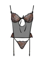 Dámský erotický korzet Goldie corset BEAUTY NIGHT FASHION - černá barva - z průsvitné síťoviny a krajky - krajkové košíčky s kosticí odhalují dekolt - zapínání na háčky - nastavitelná ramínka - podvazkové pásky - krajková tanga