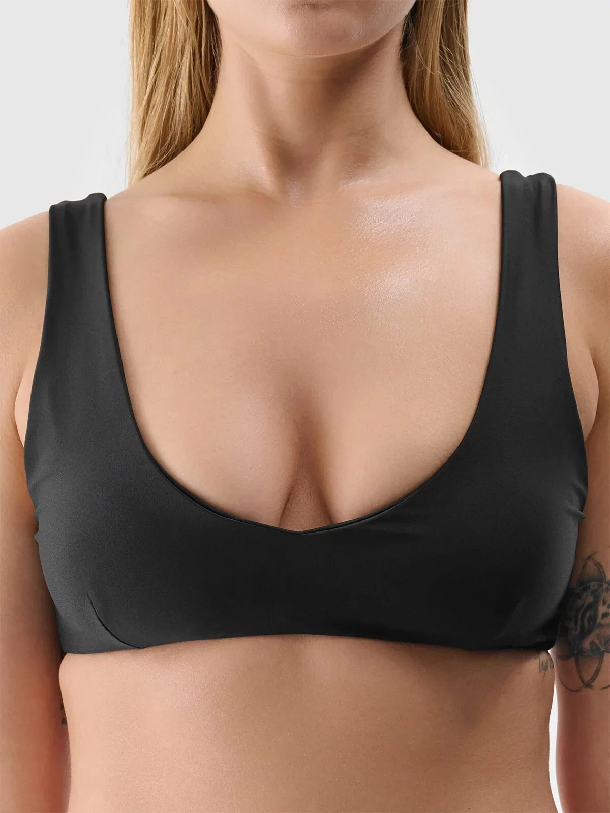 Rychleschnoucí vlákna podporují odvádění vlhkosti daleko od těla. balkonový střih s ramínky, inspirovaný tradiční podprsenkou. Výstřih do V. Zapínání na kovovou sponu. Košíčky s vyjímatelnými vložkami. Pohodlná, širší ramínka bez nastavení. Výstřih na zádech.