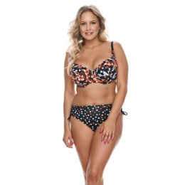 Bikinová podprsenka určená pro ženy, které jsou od přírody štědřeji obdařené. Podprsenka je vyrobena z úpletu s květinovým motivem, má měkké košíčky s modelujícími průstřihy a je vyztužená kosticemi pro vynikající podporu poprsí. Popruhy jsou nastavitelné a neodnímatelné. Šířka ramínek a typ zapínání jsou přizpůsobeny velikosti plavek. Jemná dekorace mezi šálky dodává celku půvab. Ideální pro ženy s plnějšími tvary.