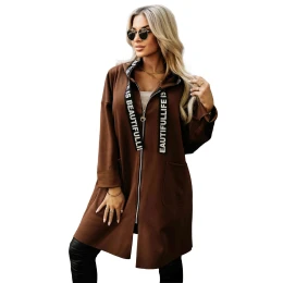 Dámský kabát 632-2 Numoco basic - hnědá barva - z měkkého a příjemného materiálu - pohodlný střih - praktické kapsy - šňůrky s potiskem - s kapucí