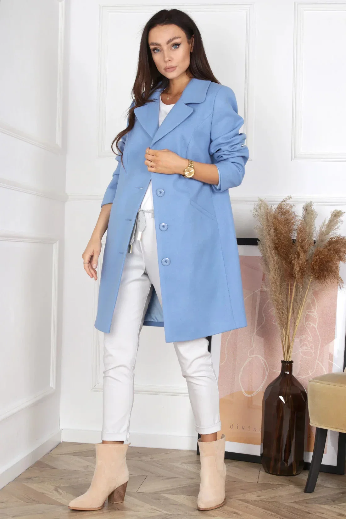 Nadčasový model s límcem a klopami. Mírně vypasovaný, jednořadově zapínaný. Délka nad kolena. Boční kapsy. Zakončené podšívkou.