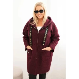 Dámský kabát Plus Size z umělé beránkové látky s kapucí a kapsami švestkový
