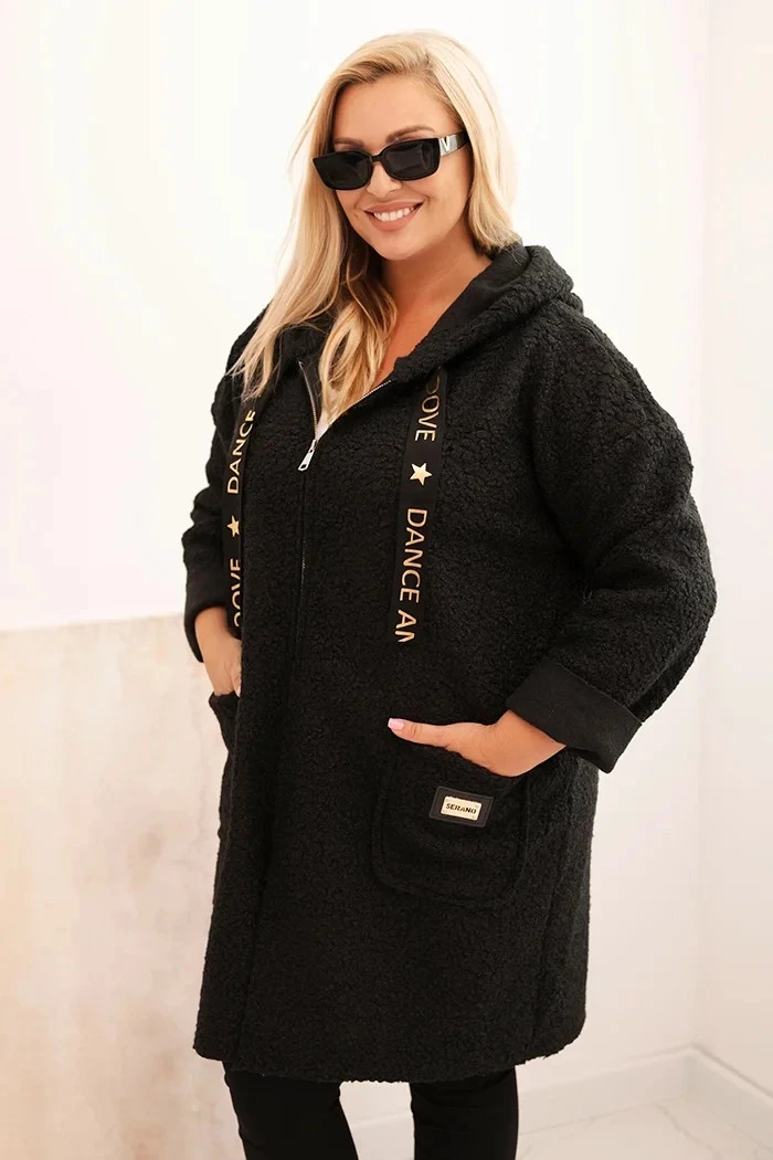 Dámský kabát Plus Size z umělého beránka s kapucí a kapsami černý