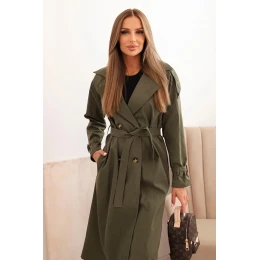 Stylový dámský kabát klasického střihu je nezbytným prvkem každého dámského šatníku. Model s efektním, širokým límcem, vázaným páskem v pase a dvojitým řadou knoflíků odkazuje na nadčasový styl trenčkotů. Délka nad kolena a zúžení v pase krásně podtrhují siluetu, přidávající celku eleganci. Rukávy s ozdobným manžetou a jemným nařasením na ramenou dodávají lehkost a ženský charakter.
