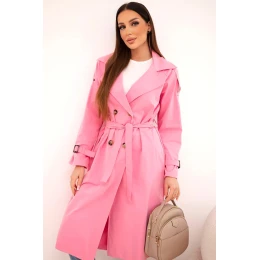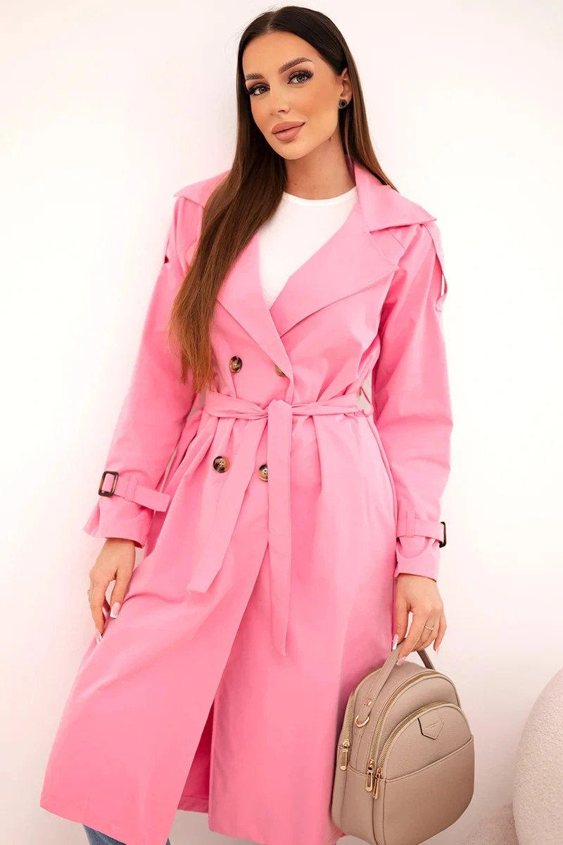 Stylový dámský kabát klasického střihu je nezbytným prvkem každého dámského šatníku. Model s efektním, širokým límcem, vázaným páskem v pase a dvojitým řadou knoflíků odkazuje na nadčasový styl trenčkotů. Délka nad kolena a zúžení v pase krásně podtrhují siluetu, přidávající celku eleganci. Rukávy s ozdobným manžetou a jemným nařasením na ramenou dodávají lehkost a ženský charakter.