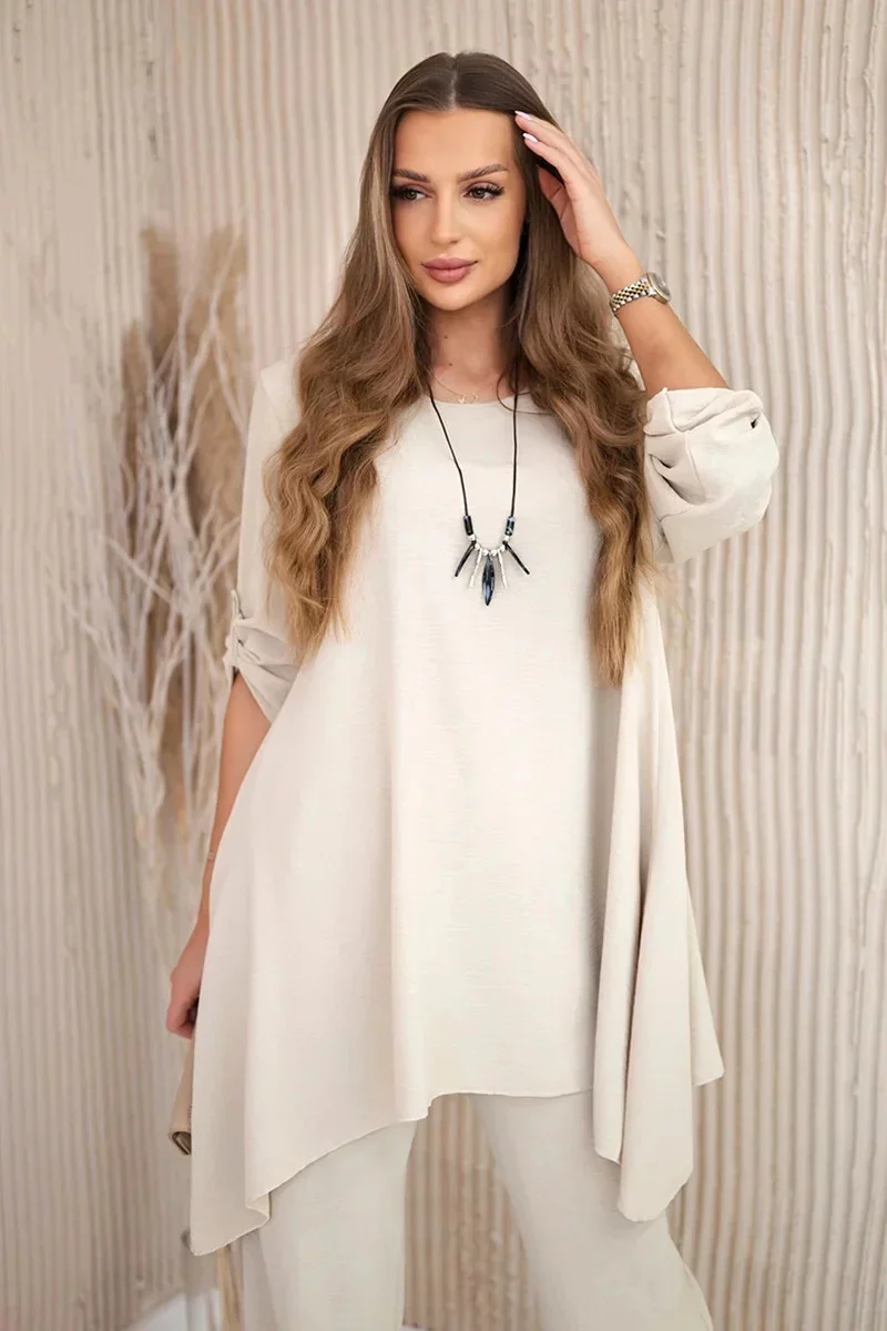 Italská dvoudílná souprava skládající se z rozšířené halenky a kalhot je elegantní souprava, která dodá kouzlo a styl každému stylu. Rozevlátá halenka dodává jemnou ženskost, zvýrazňuje postavu a zároveň zajišťuje volnost pohybu. Klasický střih kalhot dokonale ladí s elegantní halenkou a tvoří tak ucelený a stylový celek. Přívěsek ve tvaru klíče je navíc okouzlujícím detailem, který dodává této sadě originalitu a charakter a vytváří harmonickou kompozici. Jde o elegantní doplněk, který zdůrazňuje jedinečnost a smysl pro detail v celém stylingu. Tato italská souprava je ideální pro mnoho příležitostí, od obchodních schůzek až po romantická rande. Toto je rafinovaná volba pro lidi, kteří oceňují eleganci a pohodlí v jednom. Velikost je univerzální a padne ženám, které nosí velikost S, M nebo L.