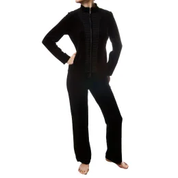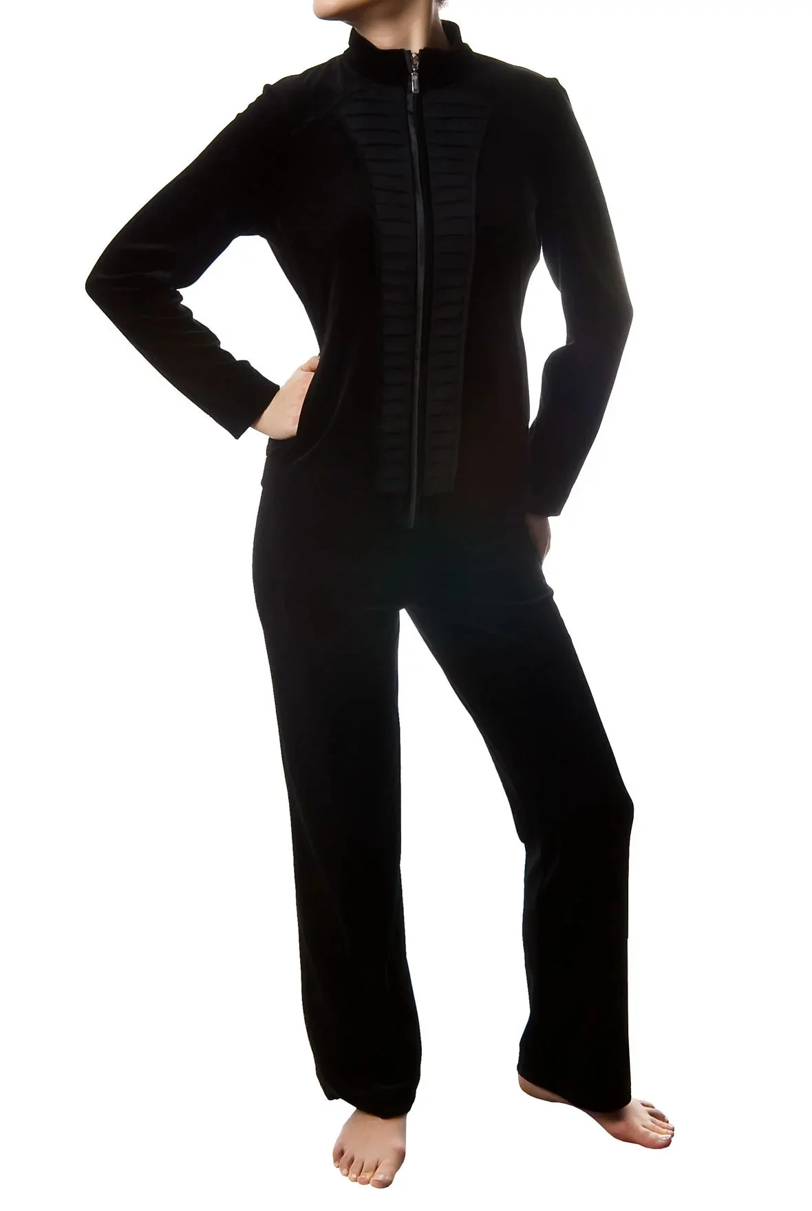 Dámský komplet 3223611 - Féraud, elegantní dámský komplet, vrchní díl z hladkého decentně lesklého materiálu, uprostřed efektně zdobený sklady, zapínání na zip. Zadní část velmi efektně ozdobena swarovskými kamínky. Kalhoty jsou z hladkého materiálu, v pase na gumu. Barva černá, materiál 55% bavlna, 20% polyester, 25% viskóza.