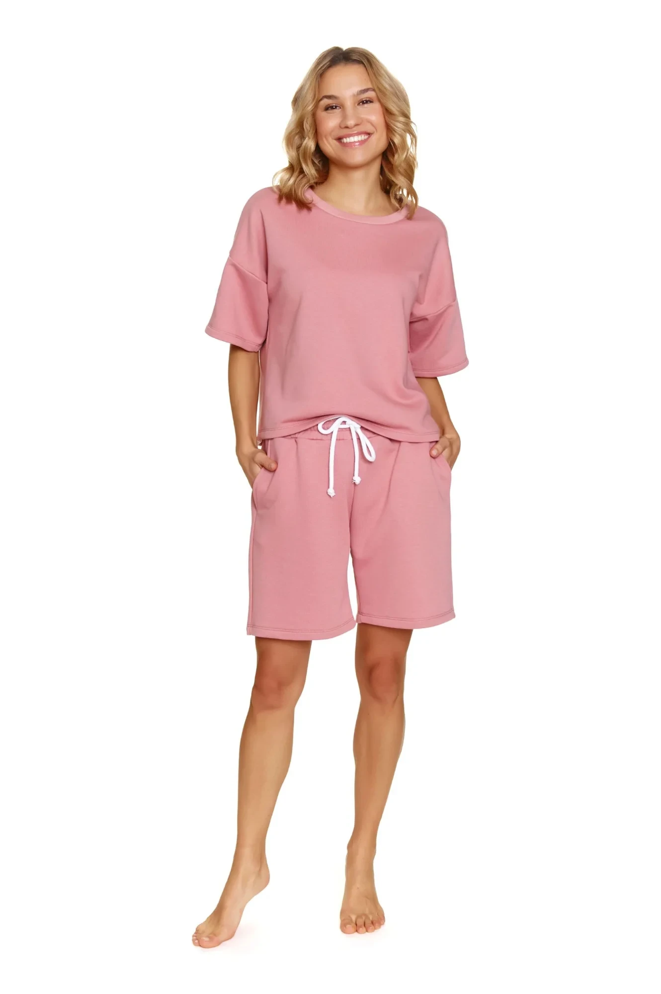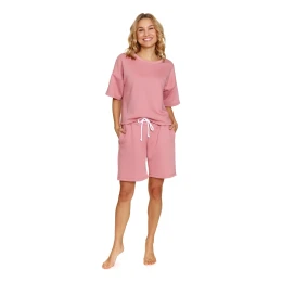 Dámský komplet 7220 pink Doctornap - z vysoce jakostní bavlny - oversize tričko růžové barvy - krátké volné rukávy - volné růžové šortky s kapsami - zavazování v pase bílou šňůrkou - certifikát OEKO-TEX Standart 100
