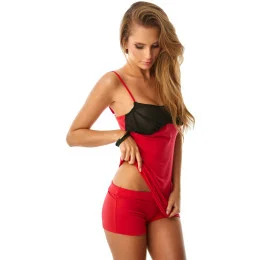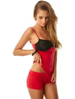 Dámské pyžámko tvoří top s úzkými nastavitelnými ramínky a krajkovým lemem a kraťasy na gumu v pase zdobené krajkou.