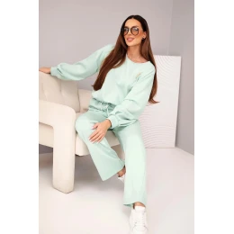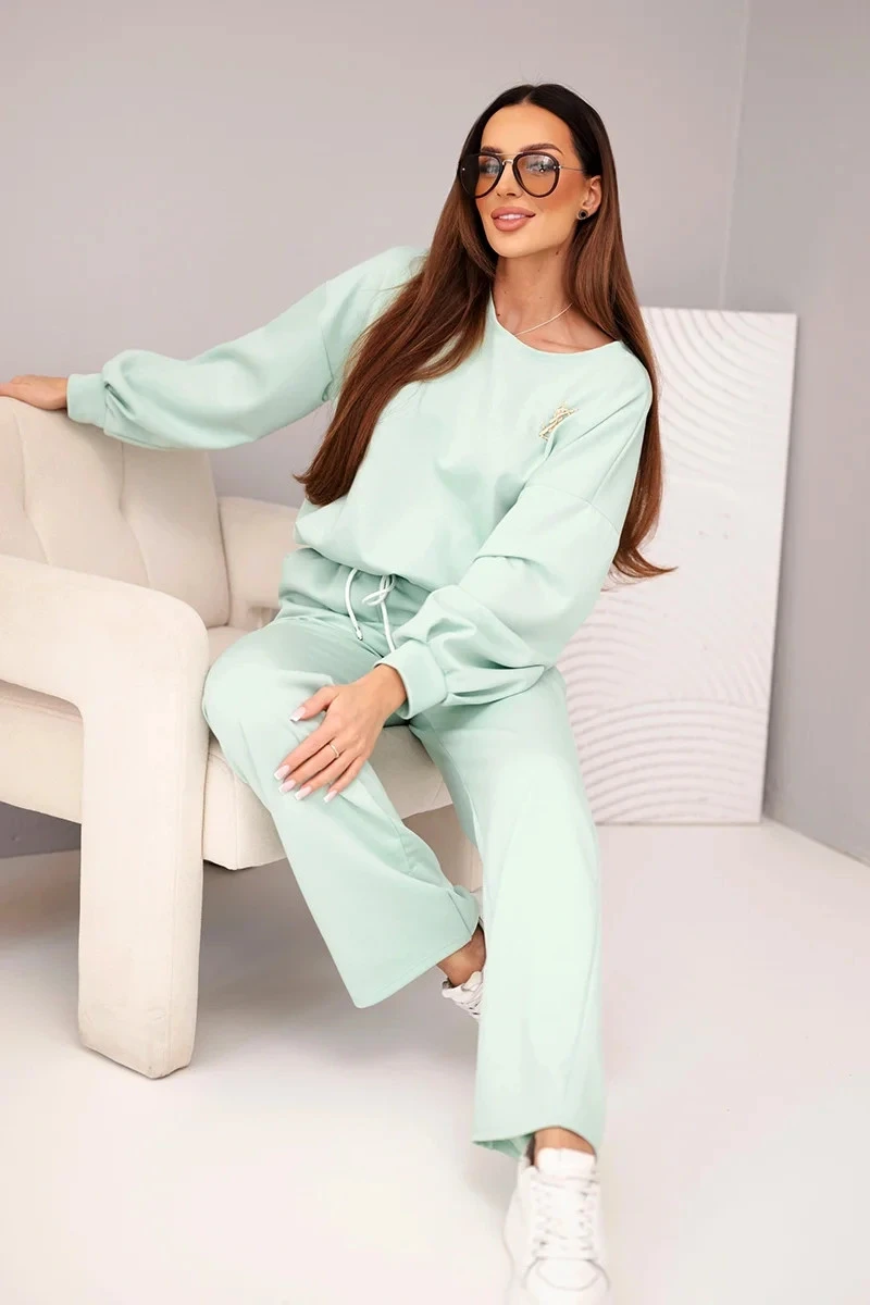 Dámský komplet máslová mikina s broží a kalhoty s rovnou nohavicí tmavě mátová