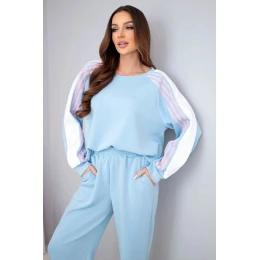 Mikina s volným střihem zajišťuje pohodlí při nošení, a ozdobné lampasy na rukávech dodávají celku sportovní charakter. Kalhoty mají v pase elastickou gumu a stahovací lemy u nohavic, díky čemuž se skvěle přizpůsobí postavě. Měkký, máslový materiál je příjemný na dotek a pružný, což zaručuje pohodlí po celý den.