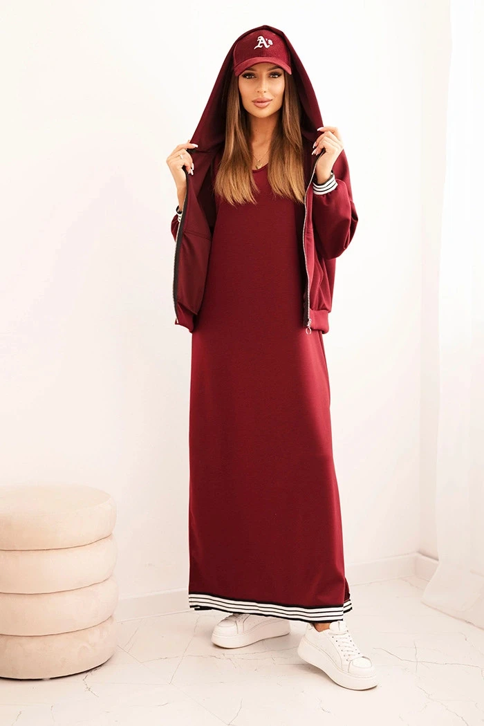 Dámský komplet s viskózou s rozepínací mikinou a dlouhou sukní bordová