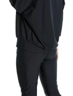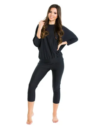 Volná blůza má v pase stahovací lem. Úzké kalhoty mají v pase širokou gumu.