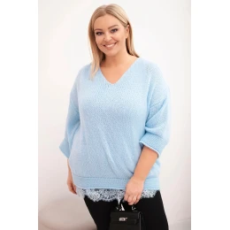 Dámský komplet svetr s výstřihem do V a viskózová blůza s krajkovým lemem modrý
