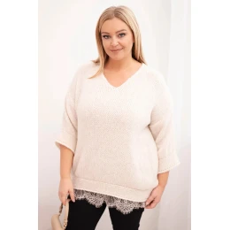 Dámský komplet svetr s výstřihem do V a viskózová blůza s krajkovým spodním lemem béžový