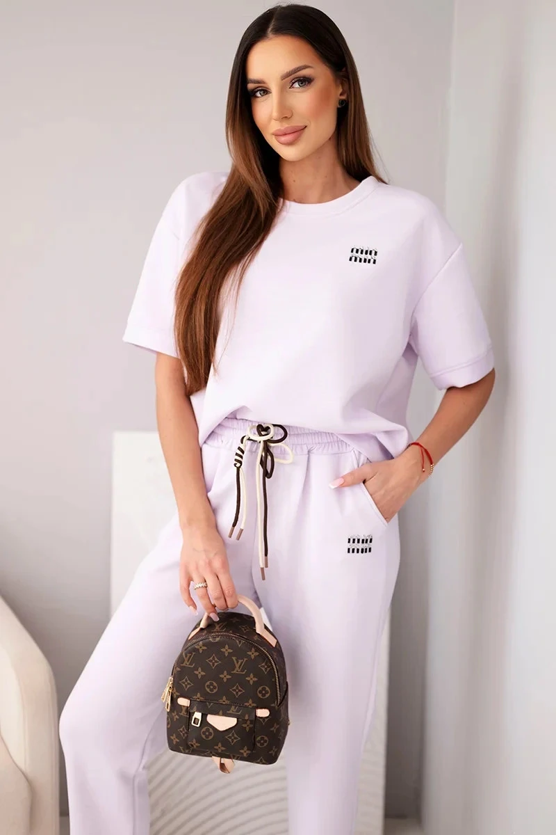 Dámský komplet viskózový máslový s krátkým rukávem a kalhotami s ohrnutím nohavice světle fialový