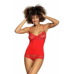 Komplet Viktorie v červené barvě. Tvoří jej košilka, která je v oblasti poprsí zdobená poloprůhlednou pružnou krajkovou látkou s květinovým motivem. Úzká ramínka jsou elastická. Komplet je převážně vytvořený z velice příjemného elastického materiálu (microfibra). Součástí jsou také kalhotky s vyvýšeným pasem tvořené nádhernou pružnou krajkovou látkou v přední části.