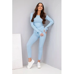 Blůzka se subtilním nařasením po stranách a přiléhavý střih legín krásně podtrhují ženskou postavu. Minimalistický střih dělá, že se komplet skvěle kombinuje s dalšími prvky garderoby, a zároveň vypadá stylově sám o sobě. Ideální na podzim a zimu jako základ pod kardigan nebo bundu.