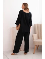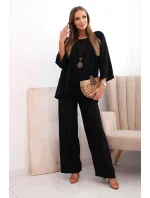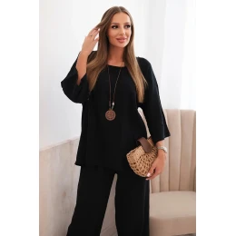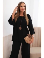 Stylový dámský komplet skládající se z lehké blůzky s rukávem 3/4 a širokých kalhot s vázáním v pase, který se skvěle hodí na každodenní nošení a do casualových stylizací. Blůzka je ozdobena elegantním náhrdelníkem, který dodává celku výjimečný charakter a podtrhuje přirozený, subtilní styl. Vyrobeno ze měkké viskózy, zajišťuje pohodlí nošení a prodyšnost i v teplejších dnech. Kalhoty s širokou nohavicí zaručují volnost pohybu a módní vzhled. Velikost je univerzální a bude vhodná pro dámy ve velikosti S, M nebo L.